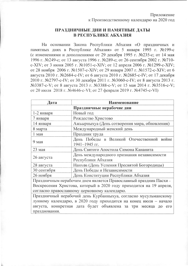 Постановление Кабинета Министров Республики Абхазия от 23.10.2019 №142 "Об утверждении Производственного календаря на 2020 год"