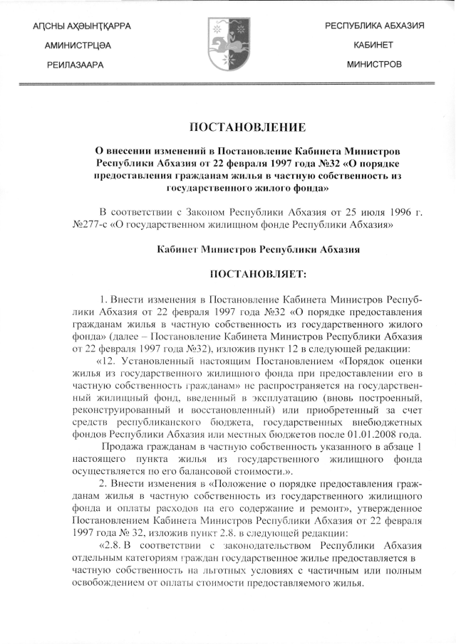 Постановление Кабинета Министров Республики Абхазия от 23.10.2019 №146 "О внесении изменении в Постановление Кабинета Министров Республики Абхазии от 22 февраля 1997 года №32 "О порядке предоставления гражданам жилья в частную собственность из государственного жилого фонда""