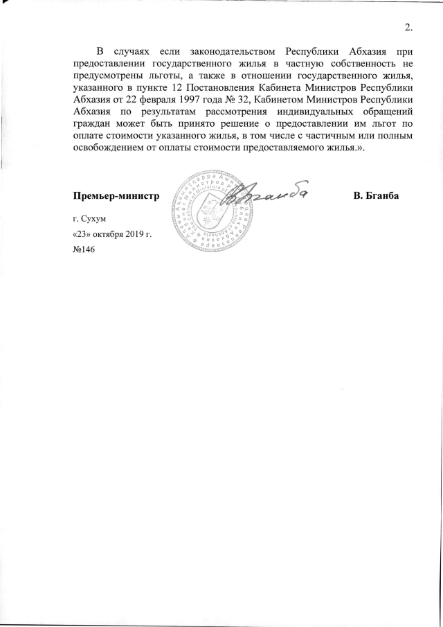Постановление Кабинета Министров Республики Абхазия от 23.10.2019 №146 "О внесении изменении в Постановление Кабинета Министров Республики Абхазии от 22 февраля 1997 года №32 "О порядке предоставления гражданам жилья в частную собственность из государственного жилого фонда""