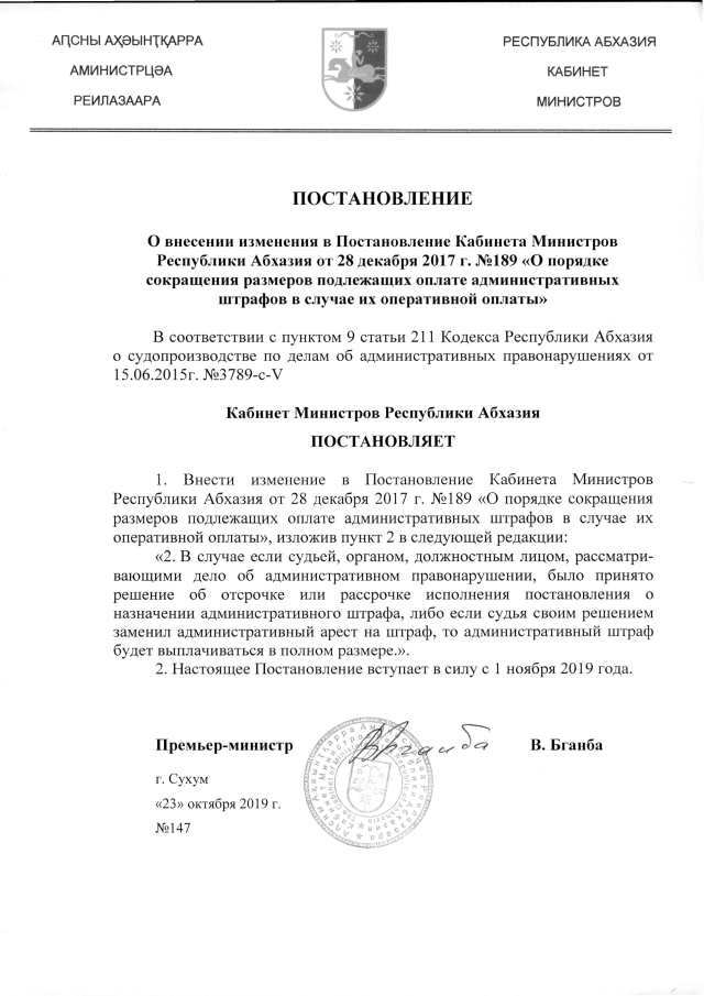 Постановление Кабинета Министров Республики Абхазия от 23.10.2019 №147 "О внесении изменения в Постановление Кабинета Министров Республики Абхазия от 28 декабря 2017 г. №189 "О порядке сокращения размеров подлежащих оплате административных штрафов в случае их оперативной оплаты""