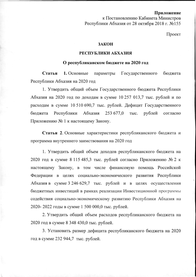 Постановление Кабинета Министров Республики Абхазия от 28.10.2019 №155 "О проекте Закона Республики Абхазия "О республиканском бюджете на 2020 год""