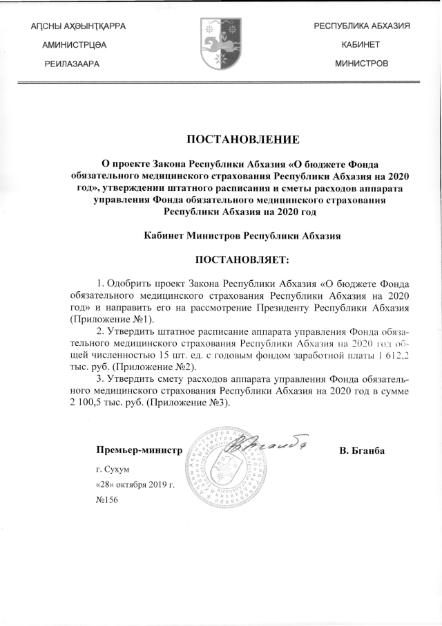 Постановление Кабинета Министров Республики Абхазия от 28.10.2019 №156 "О проекте Закона Республики Абхазия "О бюджете Фонда обязательного медицинского страхования Республики Абхазии на 2020 год", утверждении штатного расписания и сметы расходов аппарата управления Фонда обязательного медицинского страхования Республики Абхазия на 2020 год"