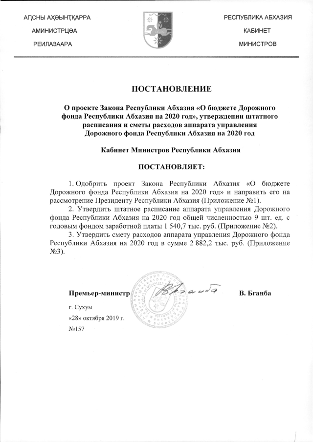 Постановление Кабинета Министров Республики Абхазия от 28.10.2019 №157 "О проекте Закона Республики Абхазия "О бюджете Дорожного фонда Республики Абхазия на 2020 год", утверждении штатного расписания и сметы расходов аппарата управления Дорожного фонда Республики Абхазия на 2020 год"