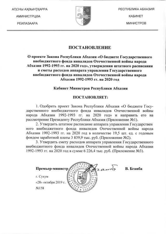 Постановление Кабинета Министров Республики Абхазия от 28.10.2019 №158 "О проекте Закона Республики Абхазии "О бюджете Государственного внебюджетного фонда инвалидов Отечественной войны народа Абхазии 1992-1993 гг. на 2020 год", утверждении штатного расписания и сметы расходов аппарата управления Государственного внебюджетного фонда инвалидов Отечественной войны народа Абхазии 1992-1993 гг. на 2020 год"