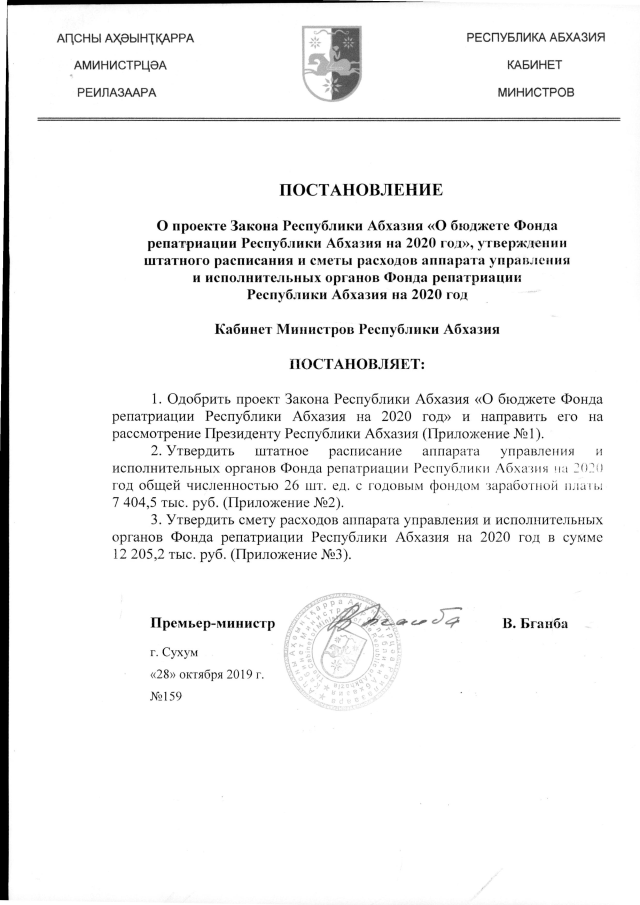 Постановление Кабинета Министров Республики Абхазия от 28.10.2019 №159 "О проекте Закона Республики Абхазия "О бюджете Фонда репатриации Республики Абхазия на 2020 год", утверждении штатного расписания и сметы расходов аппарата управления и исполнительных органов Фонда репатриации Республики Абхазия па 2020 год"