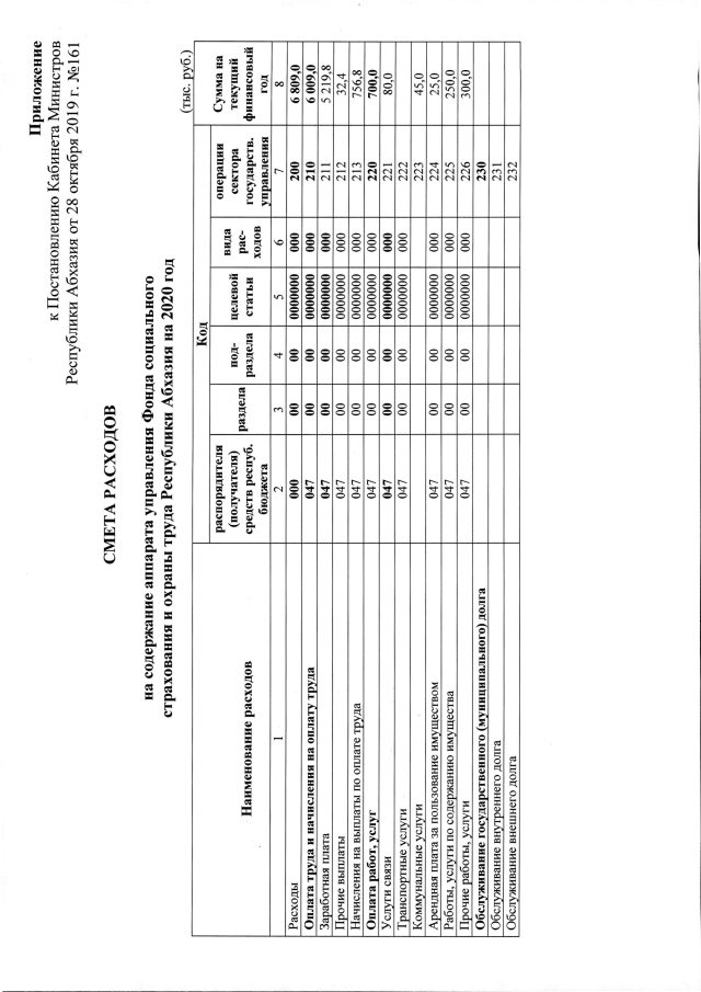 Постановление Кабинета Министров Республики Абхазия от 28.10.2019 №161 "О проекте Закона Республики Абхазия "О бюджете Фонда социального страхования и охраны труда Республики Абхазия на 2020 год", утверждении штатного расписания и сметы расходов аппарата управления Фонда социального страхования и охраны труда Республики Абхазия на 2020 год"
