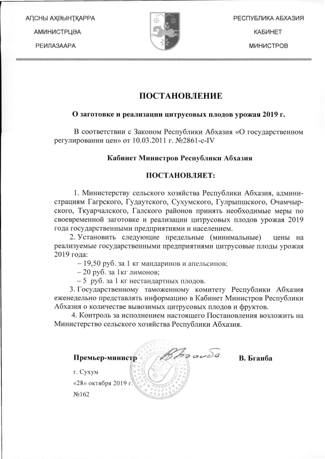 Постановление Кабинета Министров Республики Абхазия от 28.10.2019 №162 "О заготовке и реализации цитрусовых плодов урожая 2019 г."