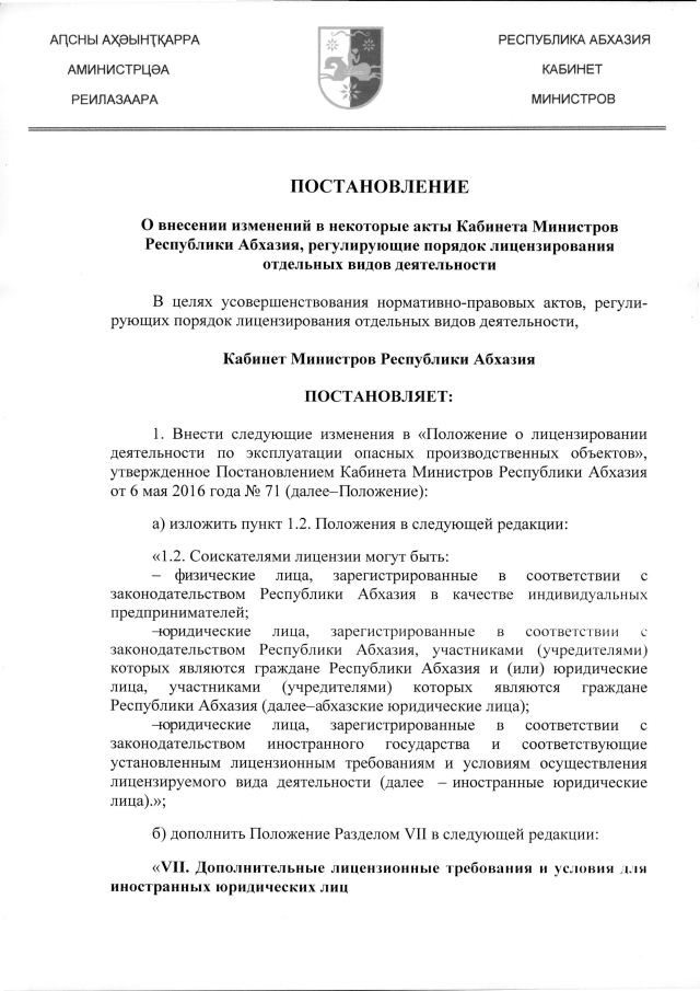 Постановление Кабинета Министров Республики Абхазия от 28.10.2019 №163 "О внесении изменений в некоторые акты Кабинета Министров Республики Абхазия, регулирующие порядок лицензирования отдельных видов деятельности"