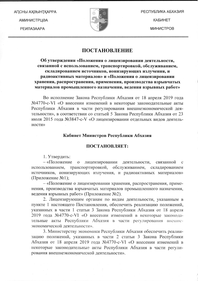 Постановление Кабинета Министров Республики Абхазия от 28.10.2019 №164 "Об утверждении "Положения о лицензировании деятельности, связанной с использованием, транспортировкой, обслуживанием, складированием источников, ионизирующих излучения, и радиоактивных материалов" и "Положения о лицензировании хранения, распространения, применения, производства взрывчатых материалов промышленного назначения, ведения взрывных работ""