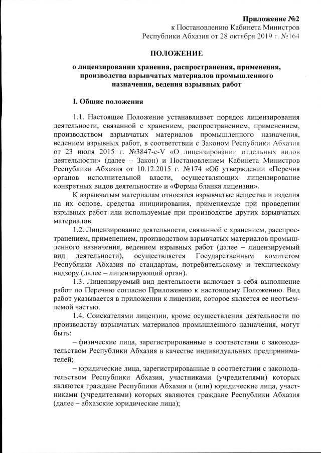 Постановление Кабинета Министров Республики Абхазия от 28.10.2019 №164 "Об утверждении "Положения о лицензировании деятельности, связанной с использованием, транспортировкой, обслуживанием, складированием источников, ионизирующих излучения, и радиоактивных материалов" и "Положения о лицензировании хранения, распространения, применения, производства взрывчатых материалов промышленного назначения, ведения взрывных работ""