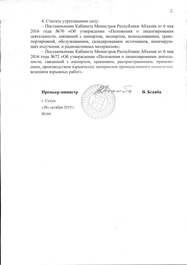 Постановление Кабинета Министров Республики Абхазия от 28.10.2019 №164 "Об утверждении "Положения о лицензировании деятельности, связанной с использованием, транспортировкой, обслуживанием, складированием источников, ионизирующих излучения, и радиоактивных материалов" и "Положения о лицензировании хранения, распространения, применения, производства взрывчатых материалов промышленного назначения, ведения взрывных работ""