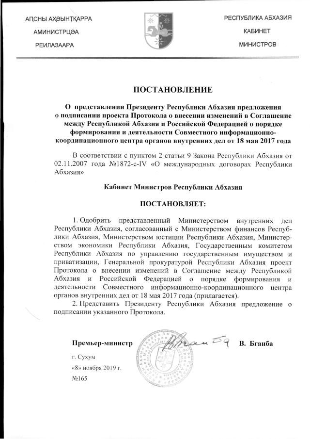 Постановление Кабинета Министров Республики Абхазия от 8.11.2019 №165 "О представлении Президенту Республики Абхазия предложения о подписании проекта Протокола о внесении изменений в Соглашение между Республикой Абхазия и Российской Федерацией о порядке формирования и деятельности Совместного информационно-координационного центра органов внутренних дел от 18 мая 2017 года"