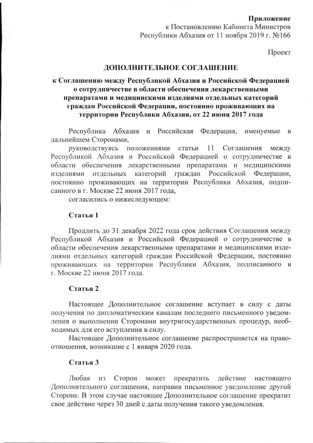 Постановление Кабинета Министров Республики Абхазия от 11.11.2019 №166 "О проекте Дополнительного соглашения к Соглашению между Республикой Абхазия и Российской Федерацией о сотрудничестве в области обеспечения лекарственными препаратами и медицинскими изделиями отдельных категорий граждан Российской Федерации, постоянно проживающих на территории Республики Абхазия, от 22 июня 2017 года"