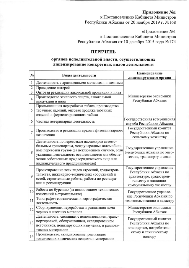 Постановление Кабинета Министров Республики Абхазия от 20.11.2019 №168 "О некоторых нормативных правовых актах Кабинета Министров Республики Абхазия в сфере лицензирования отдельных видов деятельности"
