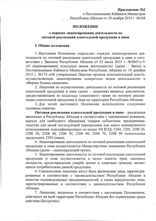 Постановление Кабинета Министров Республики Абхазия от 20.11.2019 №168 "О некоторых нормативных правовых актах Кабинета Министров Республики Абхазия в сфере лицензирования отдельных видов деятельности"