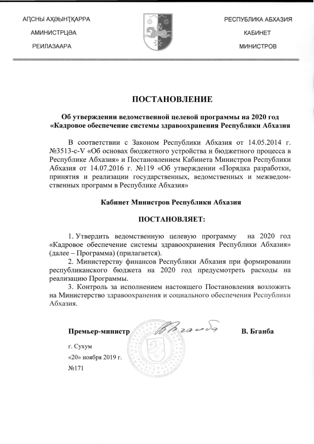 Постановление Кабинета Министров Республики Абхазия от 20.11.2019 №171 "Об утверждении ведомственной целевой программы на 2020 год "Кадровое обеспечение системы здравоохранения Республики Абхазия"