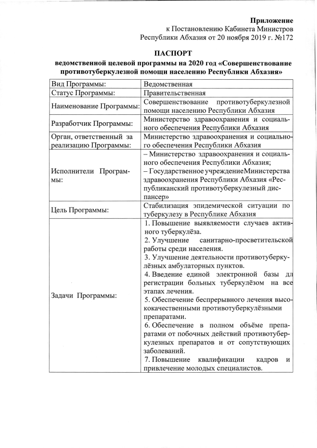 Постановление Кабинета Министров Республики Абхазия от 20.11.2019 №172 "Об утверждении ведомственной целевой программы на 2020 год "Совершенствование противотуберкулезной помощи населению Республики Абхазия""