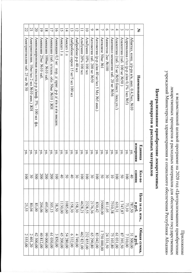 Постановление Кабинета Министров Республики Абхазия от 20.11.2019 №174 "Об утверждении ведомственной целевой программы на 2020 год "Централизованное приобретение лекарственных препаратов и расходных материалов для обеспечения государственных учреждений Министерства здравоохранения и социального обеспечения Республики Абхазия""