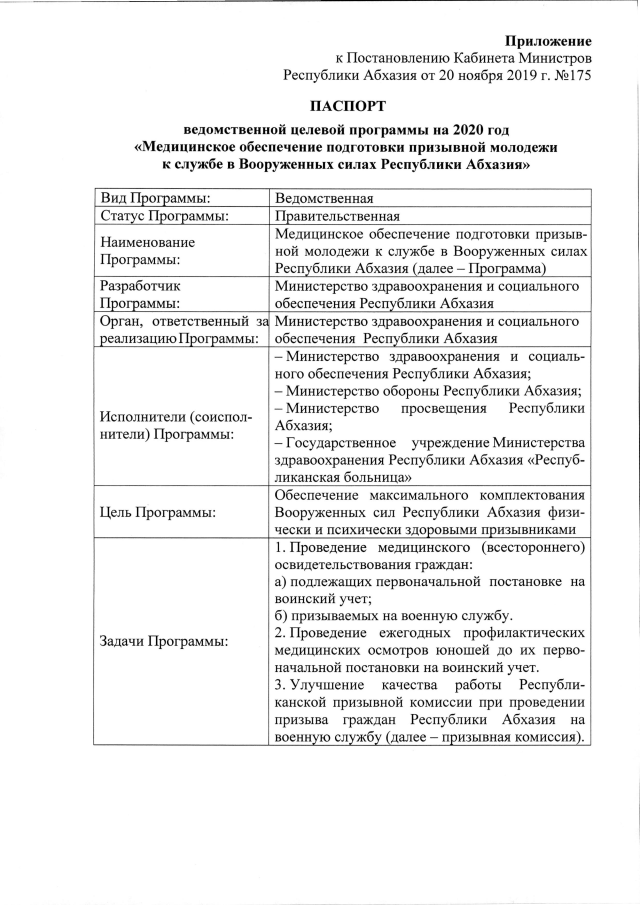 Постановление Кабинета Министров Республики Абхазия от 20.11.2019 №175 "Об утверждении ведомственной целевой программы на 2020 год "Медицинское обеспечение подготовки призывной молодежи к службе в Вооруженных силах Республики Абхазия""