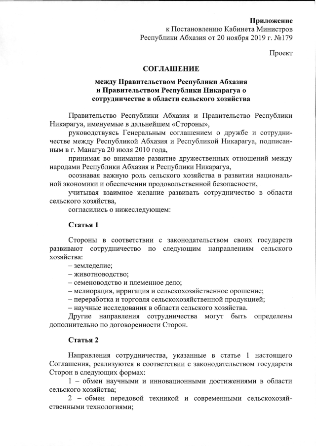 Постановление Кабинета Министров Республики Абхазия от 20.11.2019 №179 "О заключении Соглашения между Правительством Республики Абхазия и Правительством Республики Никарагуа о сотрудничестве в области сельского хозяйства"