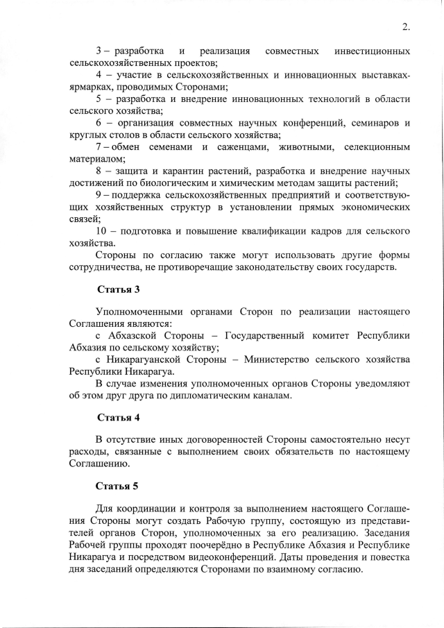 Постановление Кабинета Министров Республики Абхазия от 20.11.2019 №179 "О заключении Соглашения между Правительством Республики Абхазия и Правительством Республики Никарагуа о сотрудничестве в области сельского хозяйства"