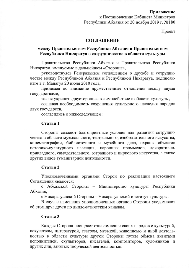 Постановление Кабинета Министров Республики Абхазия от 20.11.2019 №180 "О заключении Соглашения между Правительством Республики Абхазия и Правительством Республики Никарагуа о сотрудничестве в области культуры"
