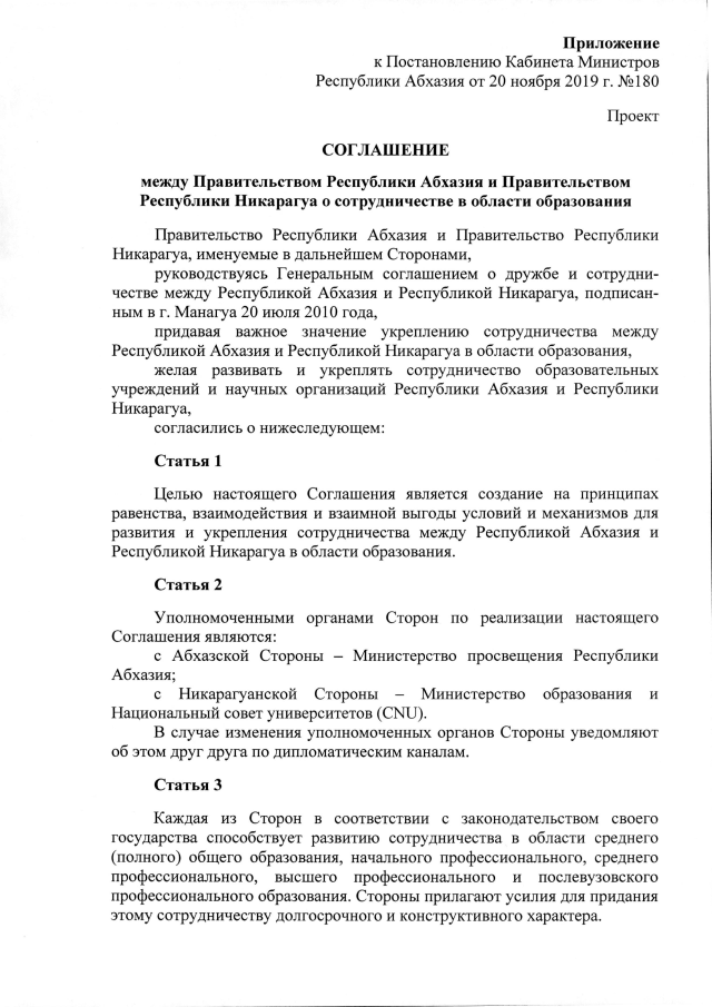Постановление Кабинета Министров Республики Абхазия от 20.11.2019 №181 "О заключении Соглашения между Правительством Республики Абхазия и Правительством Республики Никарагуа о сотрудничестве в области образования"