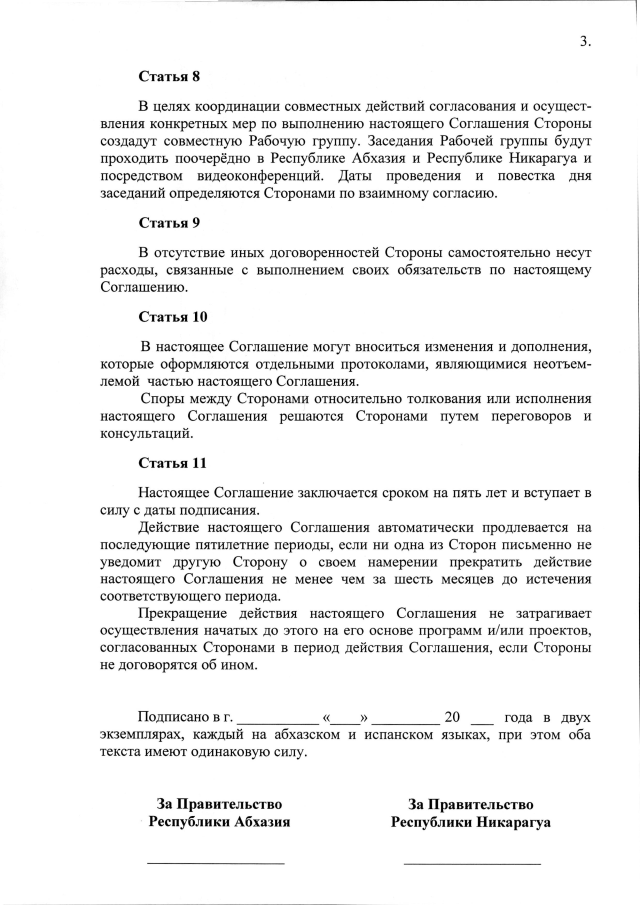 Постановление Кабинета Министров Республики Абхазия от 20.11.2019 №181 "О заключении Соглашения между Правительством Республики Абхазия и Правительством Республики Никарагуа о сотрудничестве в области образования"