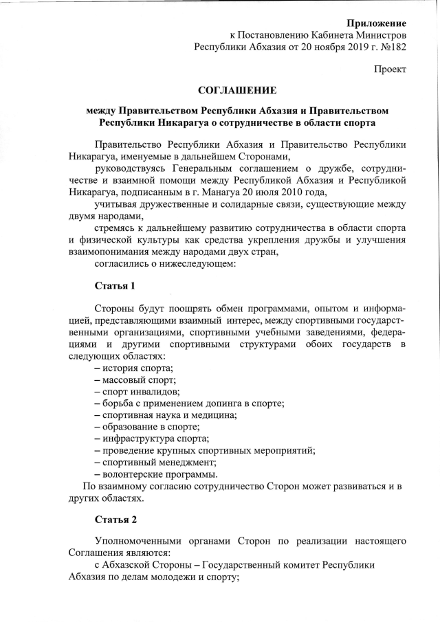 Постановление Кабинета Министров Республики Абхазия от 20.11.2019 №182 "О заключении Соглашения между Правительством Республики Абхазия и Правительством Республики Никарагуа о сотрудничестве в области спорта"