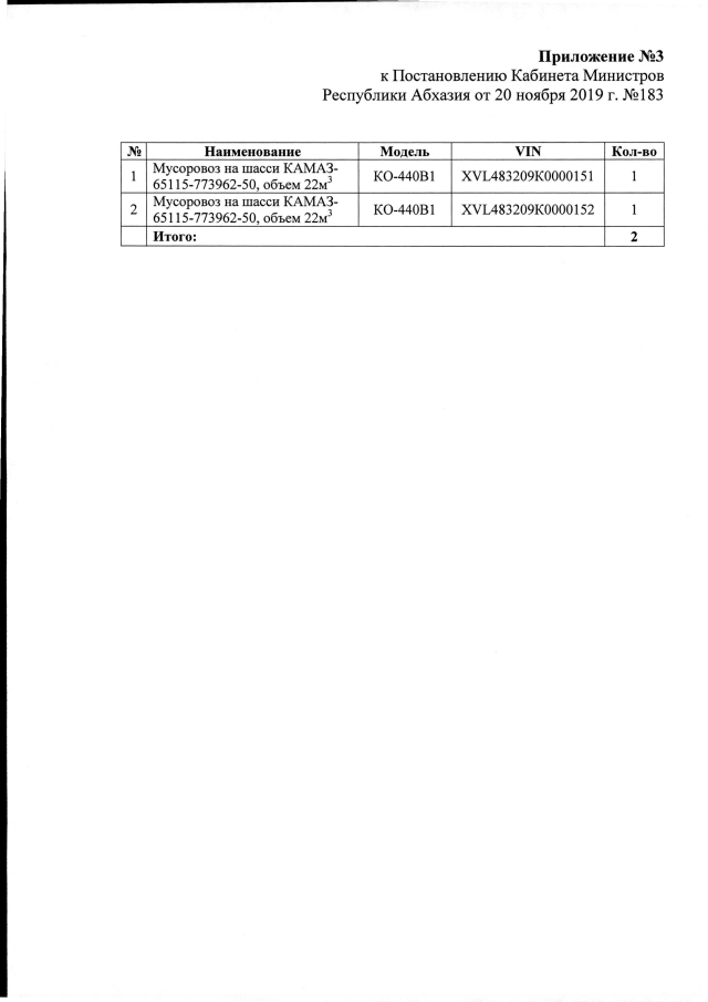 Постановление Кабинета Министров Республики Абхазия от 20.11.2019 №183 "Об освобождении Министерства экономики Республики Абхазия, Министерства здравоохранения и социального обеспечения Республики Абхазия, Государственного управления Республики Абхазия по строительству от уплаты таможенных платежей на ввозимые из Российской Федерации автобусы, автомобили скорой помощи и уборочной техники"
