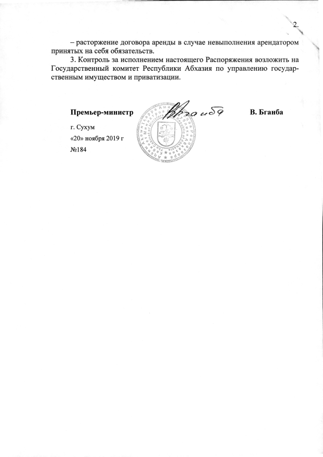 Постановление Кабинета Министров Республики Абхазия от 20.11.2019 №184 "О передаче Государственным комитетом Республики Абхазия по управлению государственным имуществом и приватизации ООО "Да-экспорт" в аренду склада готовой продукции в п. Гулрыпш Гулрыпшского района"