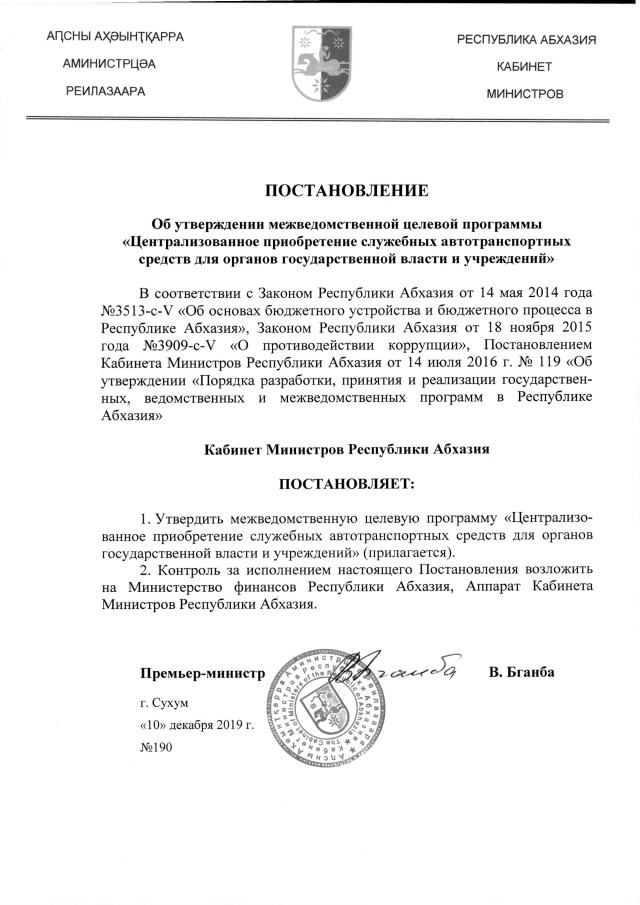 Постановление Кабинета Министров Республики Абхазия от 10.12.2019 №190 "Об утверждении межведомственной целевой программы "Централизованное приобретение служебных автотранспортных средств для органов государственной власти и учреждений""