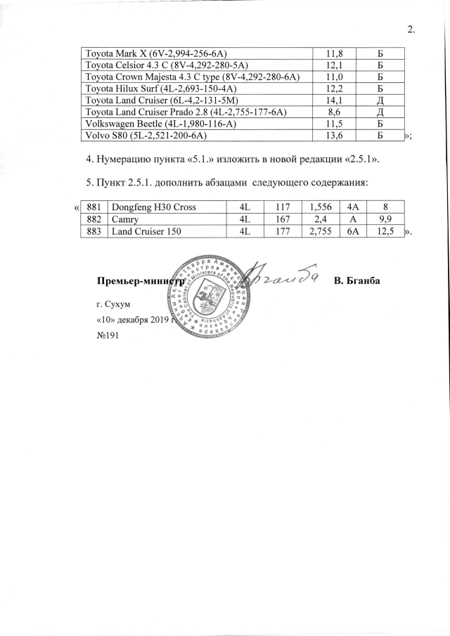 Постановление Кабинета Министров Республики Абхазия от 10.12.2019 №191 "О внесении изменений в Постановление Кабинета Министров Республики Абхазия от 30 ноября 2018 г. №177 "Об утверждении "Норм расхода топлива и смазочных материалов на автомобильном транспорте Республики Абхазия""