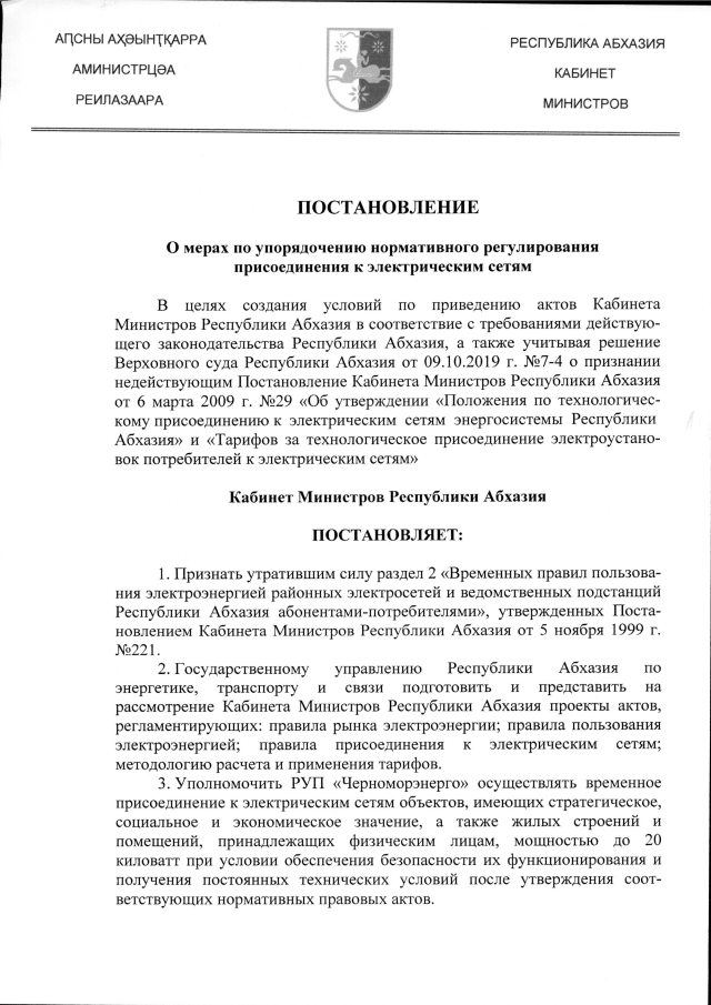 Постановление Кабинета Министров Республики Абхазия от 10.12.2019 №192 "О мерах по упорядочению нормативного регулирования присоединения к электрическим сетям"