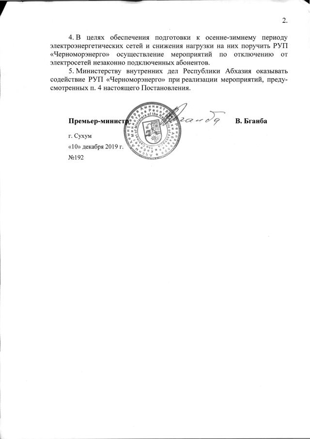 Постановление Кабинета Министров Республики Абхазия от 10.12.2019 №192 "О мерах по упорядочению нормативного регулирования присоединения к электрическим сетям"