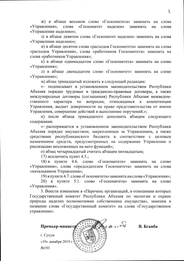Постановление Кабинета Министров Республики Абхазия от 10.12.2019 №193 "О внесении изменений в Постановление Кабинета Министров Республики Абхазия от 28 февраля 2019 года №30 "Об утверждении "Положения о Государственном комитете Республики Абхазия по экологии и охране природы""
