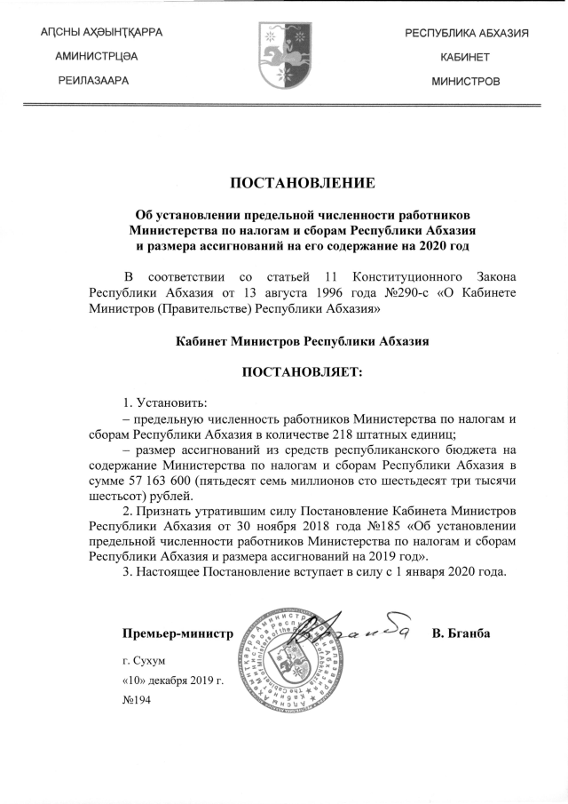 Постановление Кабинета Министров Республики Абхазия от 10.12.2019 №194 "Об установлении предельной численности работников Министерства по налогам и сборам Республики Абхазия и размера ассигнований на его содержание на 2020 год"