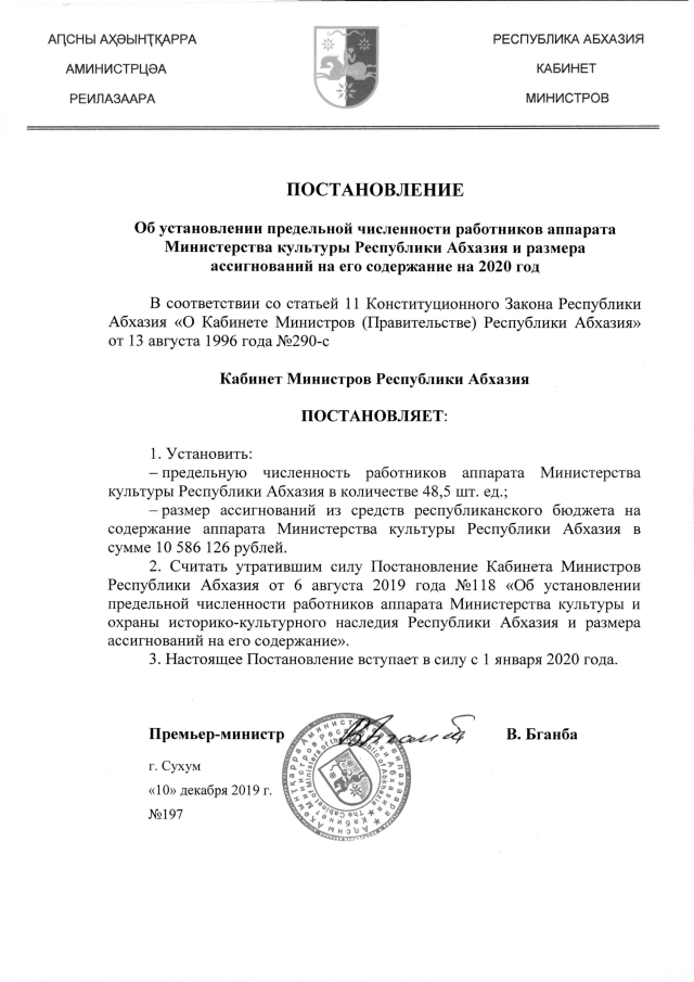 Постановление Кабинета Министров Республики Абхазия от 10.12.2019 №197 "Об установлении предельной численности работников аппарата Министерства культуры Республики Абхазия и размера ассигнований на его содержание на 2020 год"