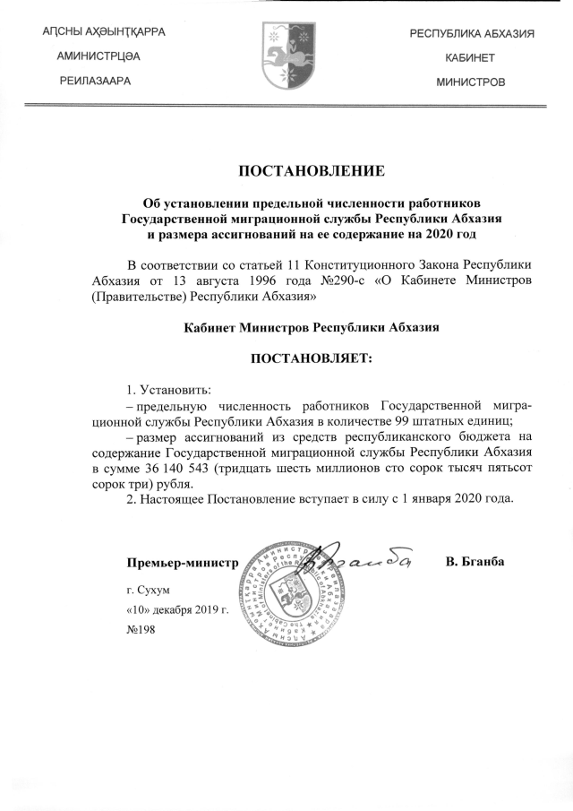 Постановление Кабинета Министров Республики Абхазия от 10.12.2019 №198 "Об установлении предельной численности работников Государственной миграционной службы Республики Абхазия и размера ассигнований на ее содержание на 2020 год"