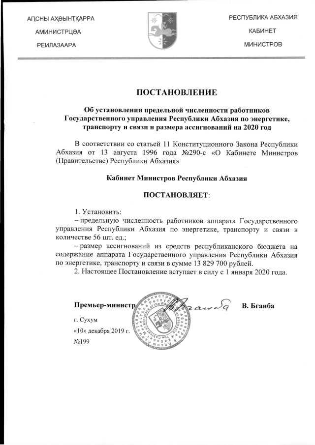 Постановление Кабинета Министров Республики Абхазия от 10.12.2019 №199 "Об установлении предельной численности работников Государственного управления Республики Абхазия по энергетике, транспорту и связи и размера ассигнований на 2020 год"