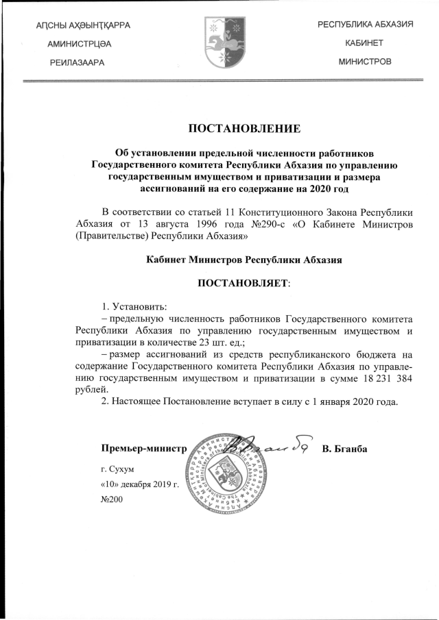Постановление Кабинета Министров Республики Абхазия от 10.12.2019 №200 "Об установлении предельной численности работников Государственного комитета Республики Абхазия по управлению государственным имуществом и приватизации и размера ассигнований на его содержание на 2020 год"
