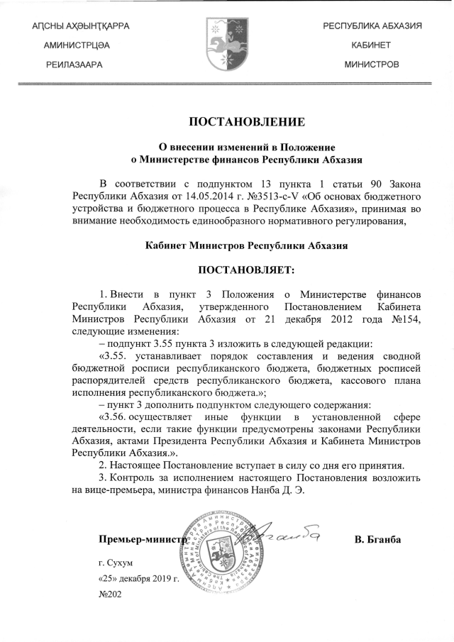 Постановление Кабинета Министров Республики Абхазия от 25.12.2019 №202 "О внесении изменений в Положение о Министерстве финансов Республики Абхазия"