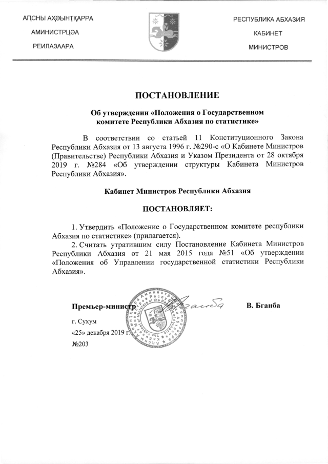 Постановление Кабинета Министров Республики Абхазия от 25.12.2019 №203 "Об утверждении "Положения о Государственном комитете Республики Абхазия по статистике""