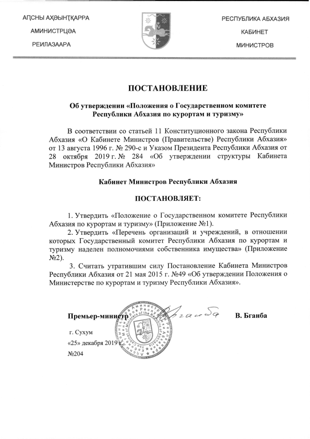 Постановление Кабинета Министров Республики Абхазия от 25.12.2019 №204 "Об утверждении "Положения о Государственном комитете Республики Абхазия по курортам и туризму""