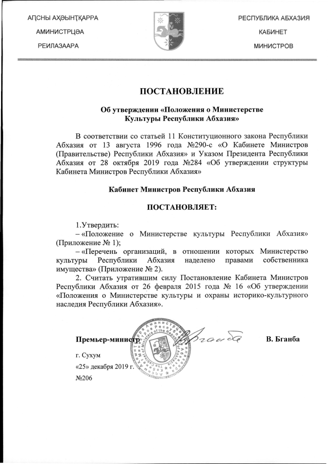 Постановление Кабинета Министров Республики Абхазия от 25.12.2019 №206 "Об утверждении "Положения о Министерстве Культуры Республики Абхазия""