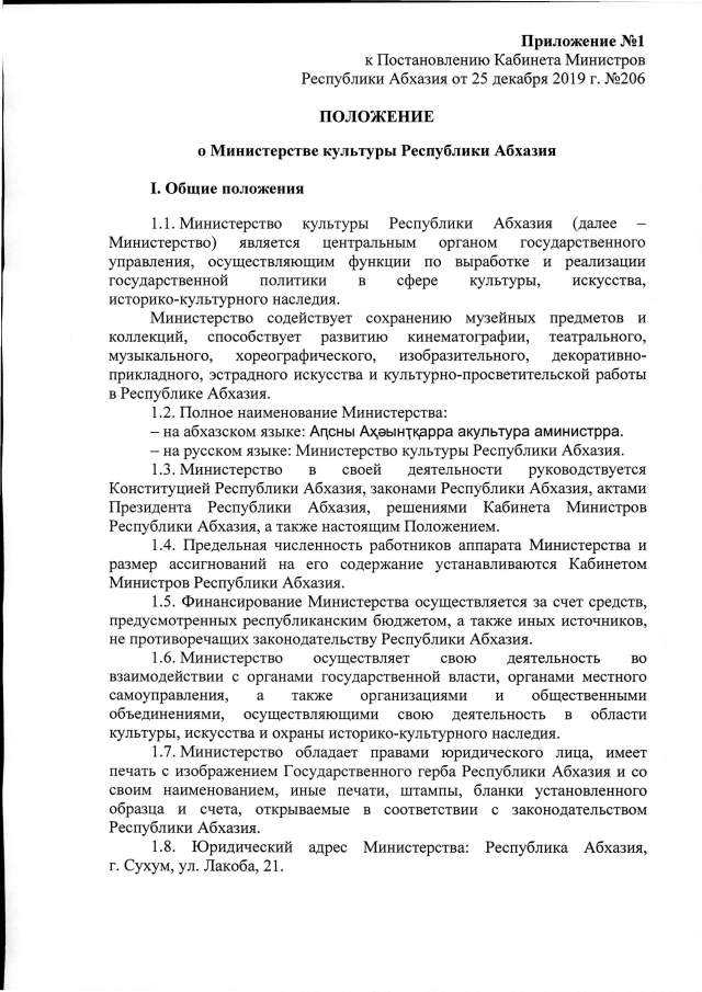 Постановление Кабинета Министров Республики Абхазия от 25.12.2019 №206 "Об утверждении "Положения о Министерстве Культуры Республики Абхазия""