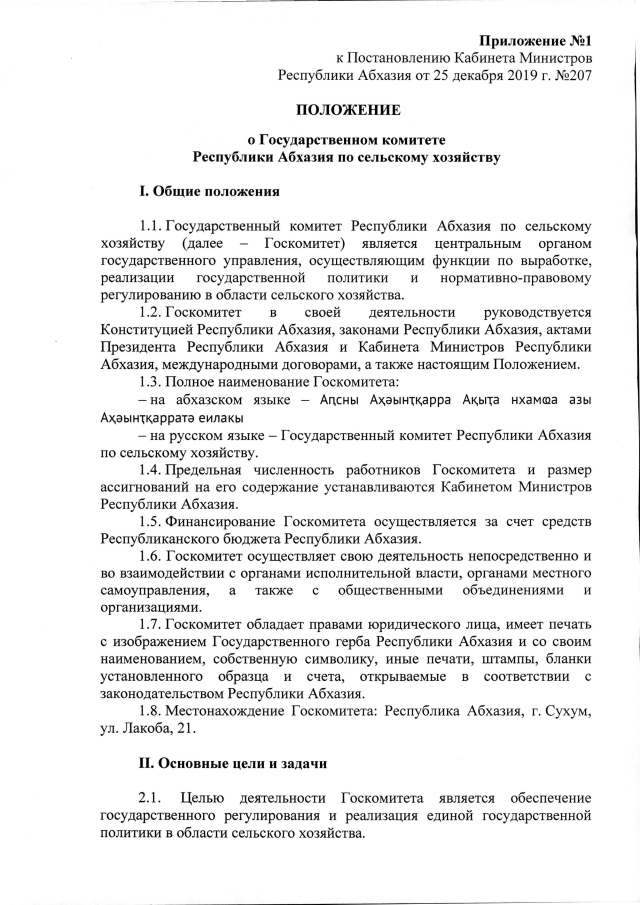Постановление Кабинета Министров Республики Абхазия от 25.12.2019 №207 "Об утверждении "Положения о Государственном комитете Республики Абхазия по сельскому хозяйству""