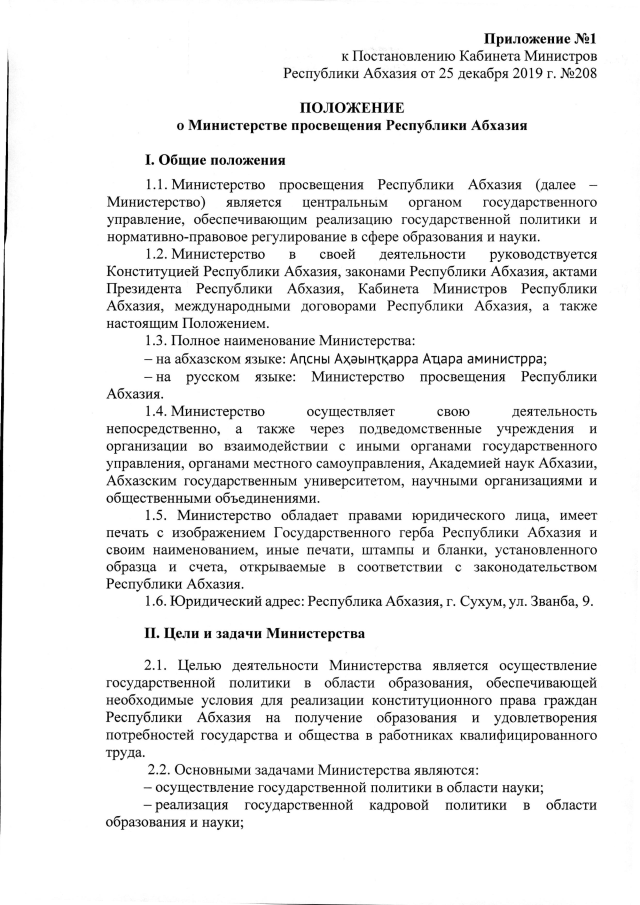 Постановление Кабинета Министров Республики Абхазия от 25.12.2019 №208 "Об утверждении Положения о Министерстве просвещения Республики Абхазия"