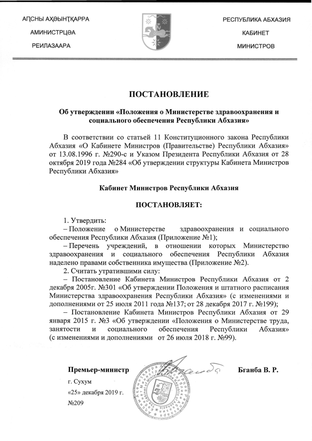 Постановление Кабинета Министров Республики Абхазия от 25.12.2019 №209 "Об утверждении "Положения о Министерстве здравоохранения и социального обеспечения Республики Абхазия""