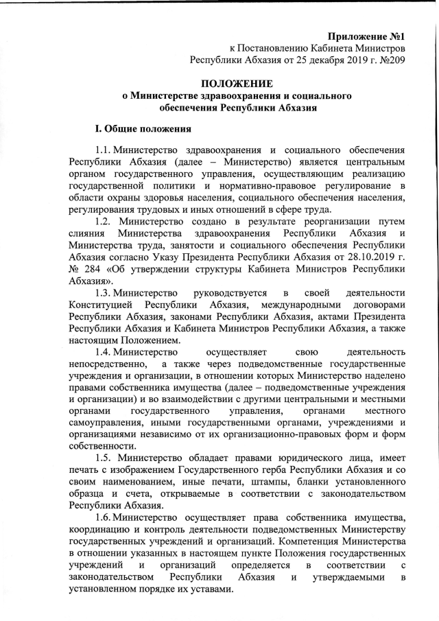 Постановление Кабинета Министров Республики Абхазия от 25.12.2019 №209 "Об утверждении "Положения о Министерстве здравоохранения и социального обеспечения Республики Абхазия""